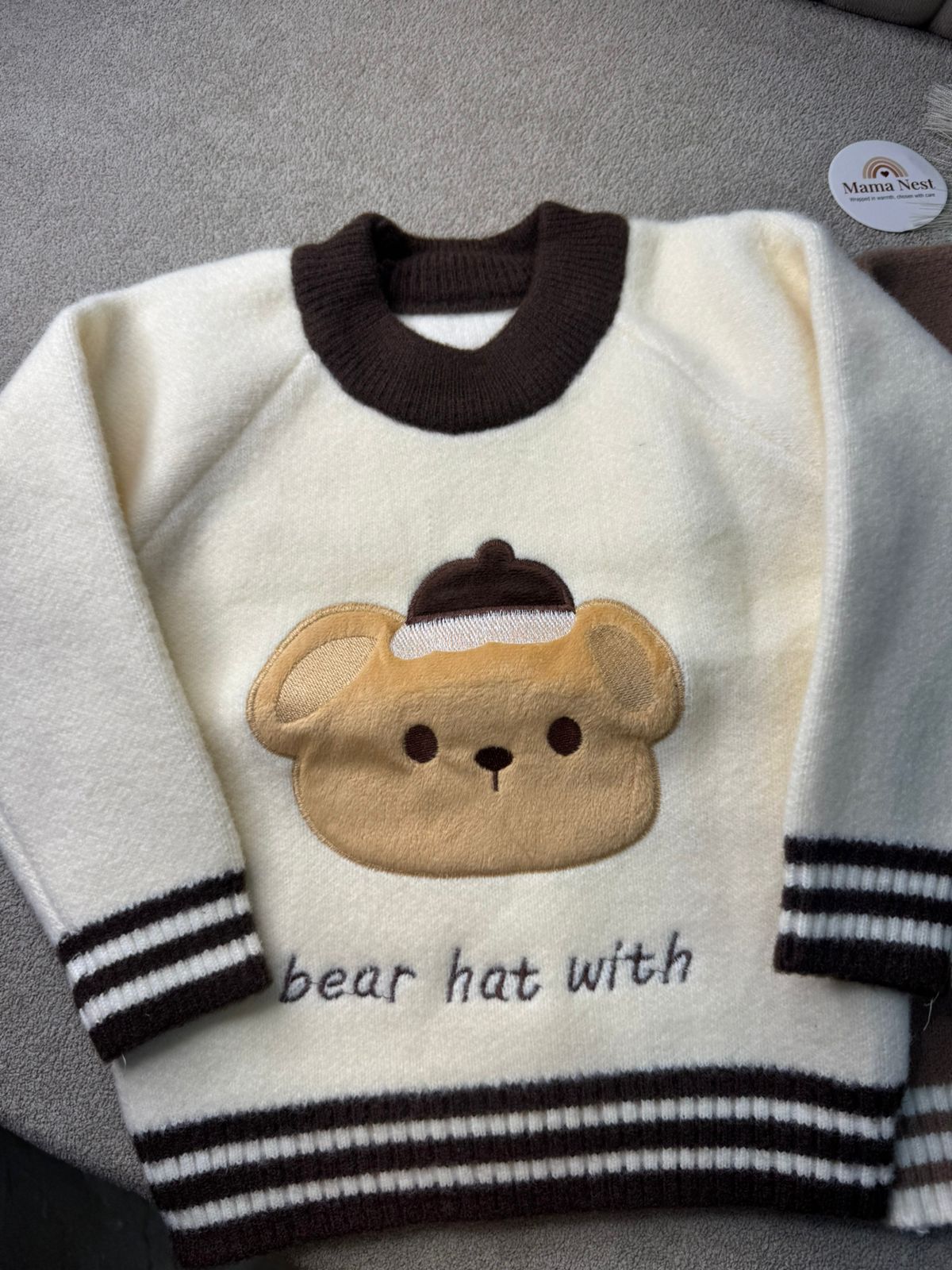 Soft, warm, and irresistibly cute — our Cream Latte Bear Hug Knit Sweater is the perfect seasonal staple. Made with a cloud-soft knit for sensitive baby skin, it features a charming bear design and a stretchy relaxed fit for all-day comfort. The creamy neutral tone makes it easy to pair with any wardrobe — a top pick for unisex styling, winter gifting, and aesthetically pleasing photos and reels.