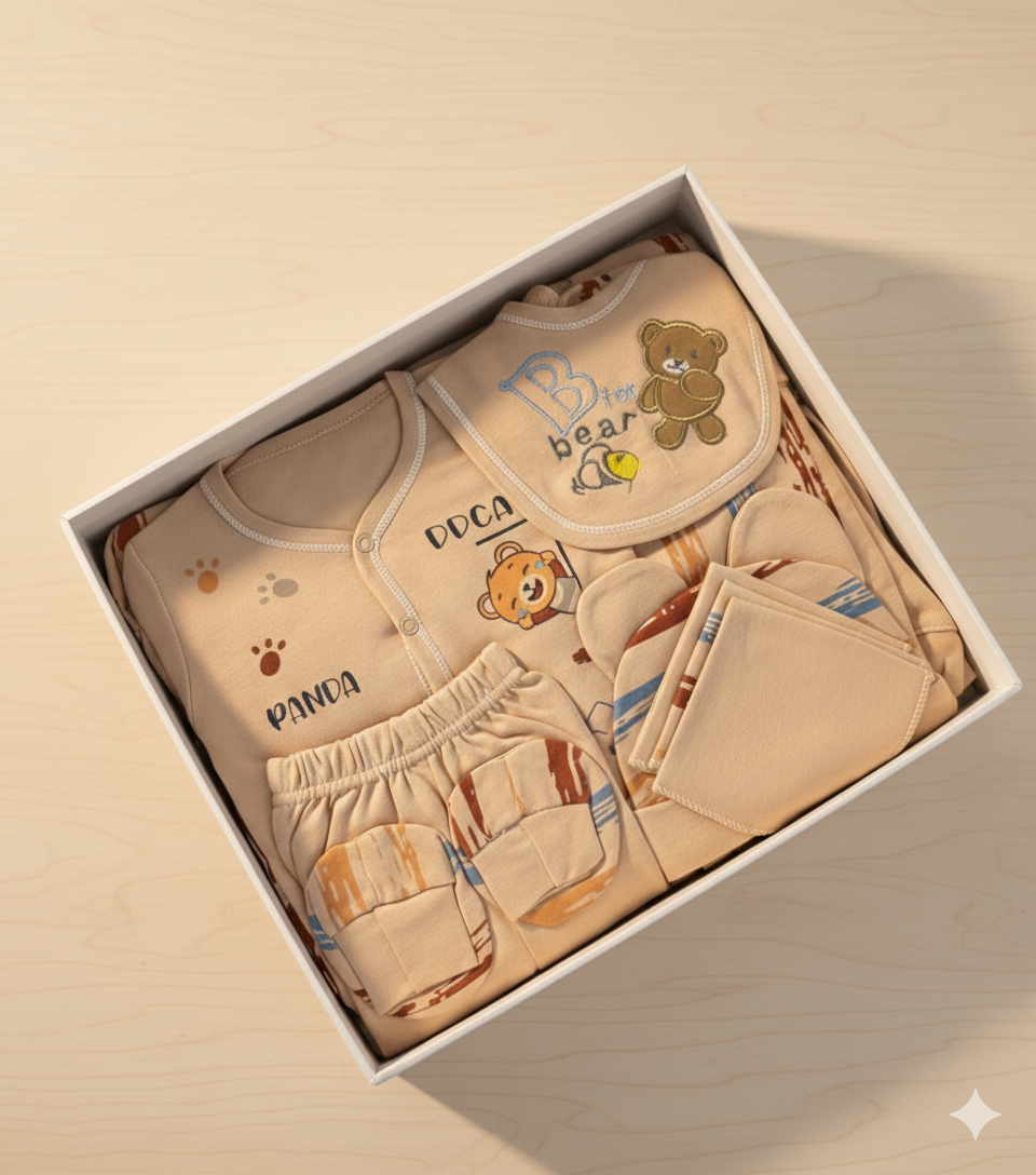 100% cotton set includes bib, mitten, cap, shirt, trousers, three washclothes and blanket—soft and cozy for your little one.